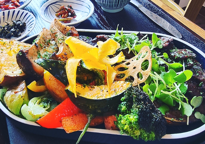*고급 한우 구이에 신선한 야채가 함께 제공됩니다. **농가의 식탁**에서 특별한 식사를 원한다면 추천합니다.*