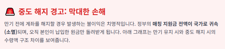 🚨 중도 해지 경고: 만기 전에 해지할 경우, 정부의 매칭 지원금 전액이 국가로 귀속되어 사라집니다. 본인 원금만 돌려받게 되므로, 어떤 경우에도 만기까지 유지하는 것이 필수입니다.