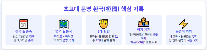 [참고] 환단고기 지지자들은 환국을 배달국과 단군조선의 정신적/혈통적 뿌리이자, 전 인류 문명의 시원 국가(Archetypal State)로 간주합니다.