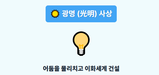 - 광명(光明) 사상: '환(桓)'과 '단(檀)'은 모두 '밝음'과 '광명'을 뜻합니다. 우리 민족은 본래 빛을 숭상하는 민족이며, 역사의 목적은 어둠(무지)을 물리치고 광명한 세상을 이화세계(理化世界)로 만드는 데 있다고 봅니다.